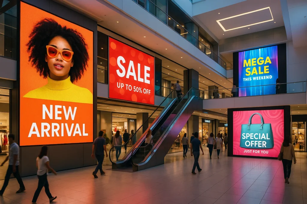 High-impact, day-bright LED displays for malls, retail spaces, highways, and urban outdoor spaces.